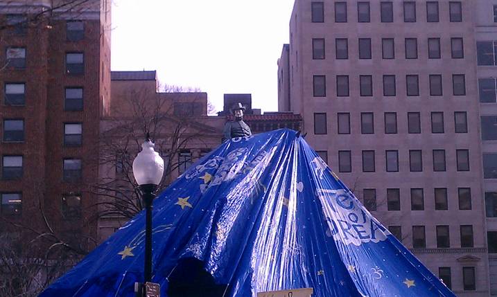 The occupiers have not only placed a huge blue tarp over the statue of the Union Army hero killed in the Battle of Atlanta in 1864, but they have mounted a Guy Fawkes mask on the late general’s head. The Guy Fawkes mask was featured in the 2005 film, V for Vendetta.