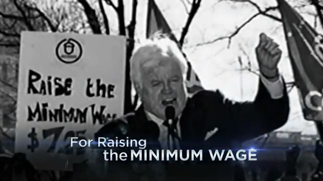 As an example of one of the supposedly noble things Captain Chappaquiddick did, footage was shown of Kennedy barking out liberal nonsense at a rally for the job-killing minimum wage, one of ACORN’s favorite issues. Right behind him in a conspicuous place appears the ACORN logo. (A screen grab appears above.)