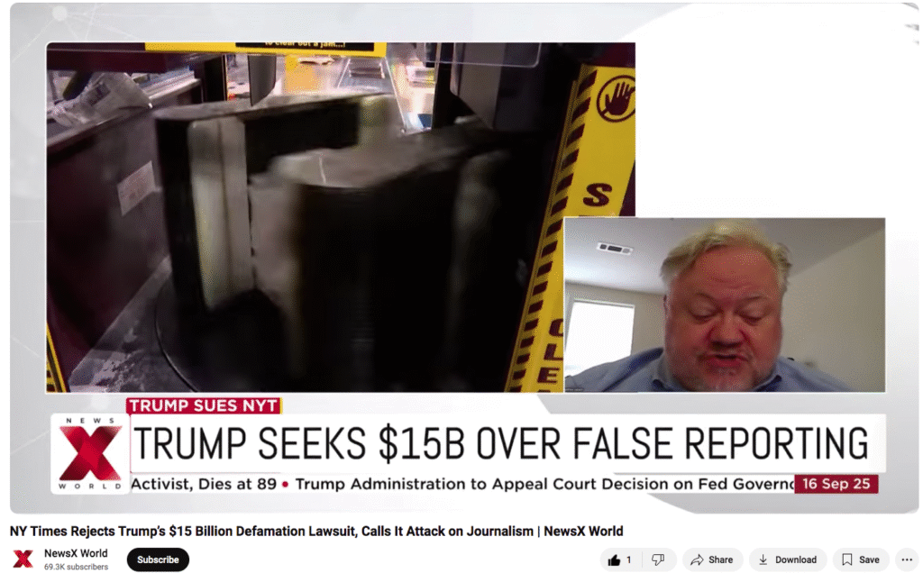 I was on NewsX World (TV in India) on Sept. 16, 2025, talking about President Donald Trump’s multi-billion-dollar lawsuit against the New York Times.