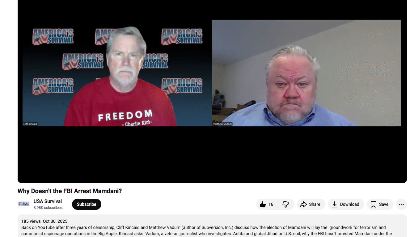Matthew Vadum appeared on Oct. 30, 2025 on Cliff Kincaid’s show, “America’s Survival,” to discuss the approaching election in which Zohran Mamdani is leading the field of candidates to become mayor of New York City.