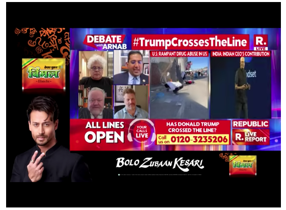 I was on “The Debate with Arnab” on April 24, 2026, on Republic TV in India. (Host Arnab Goswami is reportedly the biggest TV journalist in India. If not for that fact, I probably wouldn’t appear on his goofy, heavily slanted show, because it’s generally not a good time. Oh, and reaching out to a potentially significant percentage of the nearly 1.5 billion people in India appeals to me for some reason. I like India and have ever since I was a little kid reading Rudyard Kipling and watching “The Man Who Would Be King,” starring Sean Connery, Michael Caine, and Christopher Plummer.)