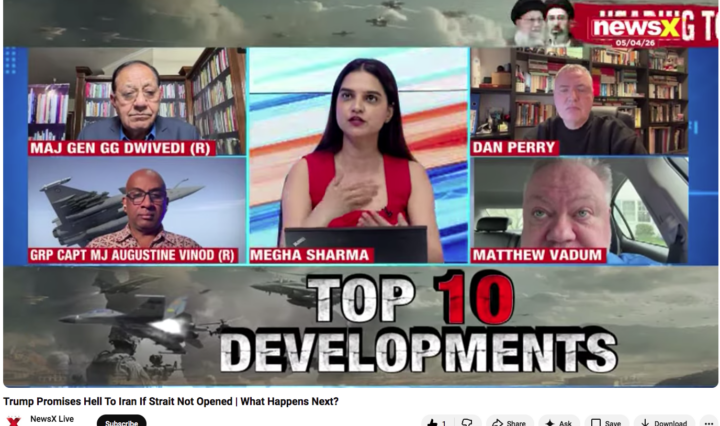 I was on NewsX in India today (April 5, 2026) discussing President Trump’s latest threat to escalate in the war against the Islamic Republic of Iran. We discussed Trump’s Truth Social post from earlier today in which he told the … Continue reading Vadum on Indian TV about Trump’s new threats against the Iranian mullahs
